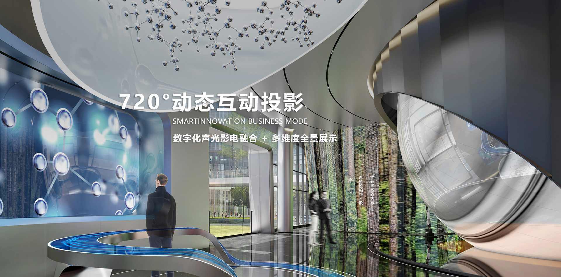 數(shù)字技術: 玻璃幕墻 、 270度弧幕影院 、 互動拍照摳像系統(tǒng)等